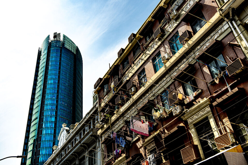 生活感を匂わせるアパートがあると思えば、その横には高層ビルが立ち並ぶ。